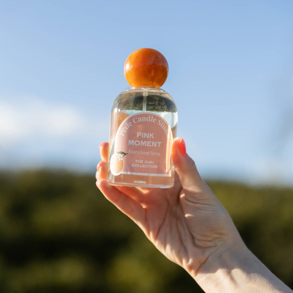 Pink Moment fragranced mist captures the warm glow of an Ojai Valley sunset in a 112 ml spray. It delivers a light luminous scent of wildflowers honey and amber so you can freshen rooms linens or your skin with a soft floral warmth.