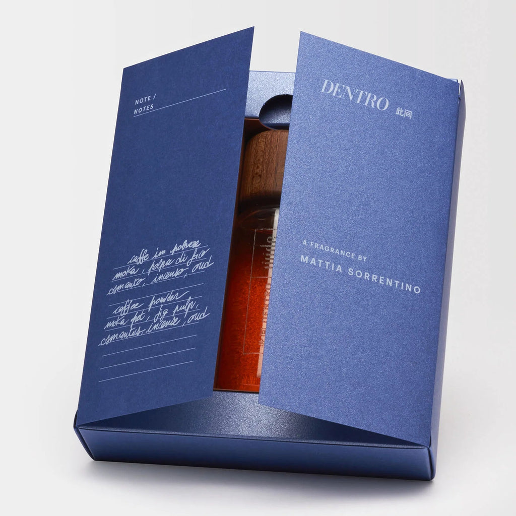 Dentro tells the story of staying in a tactile and textured fragrance. Notes of a metallic mocha pot, coffee powder, tobacco, cocoa, and incense evoke a bitter coffee sipped as an excuse to meet, spend time together, close to family. The fig transforms from green and bitter leaf to soft and sweet pulp with benzoin, osmanthus, and honey bringing the warmth and love of family; a balm for the soul. A strong and decisive olfactory narrative that speaks of the contrast between intimacy and familiarity, the challenge of putting down roots where one has always been.