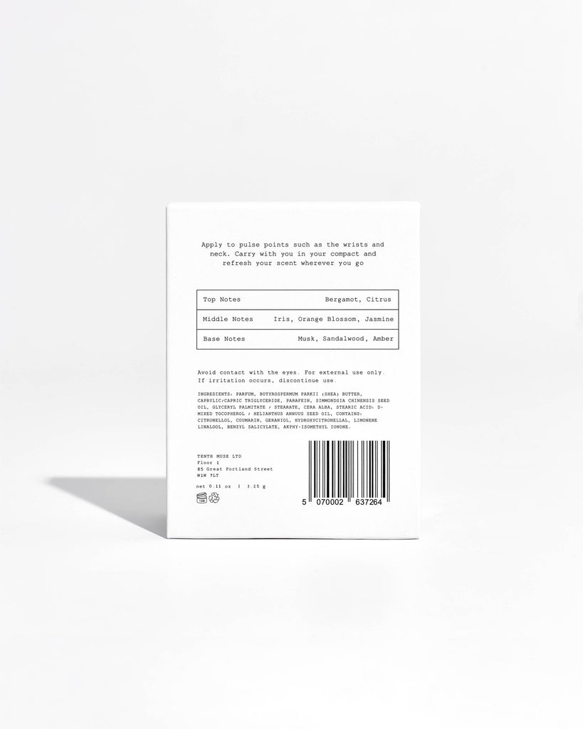 Tenth Muse presents a compact, wax-based solid perfume designed for effortless, on-the-go fragrance. It can be used directly from the pan or paired with the signature yellow metal case for a refined, travel-ready touch.